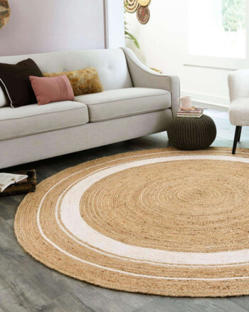 Round Circle Design White and Beige Jute Rug